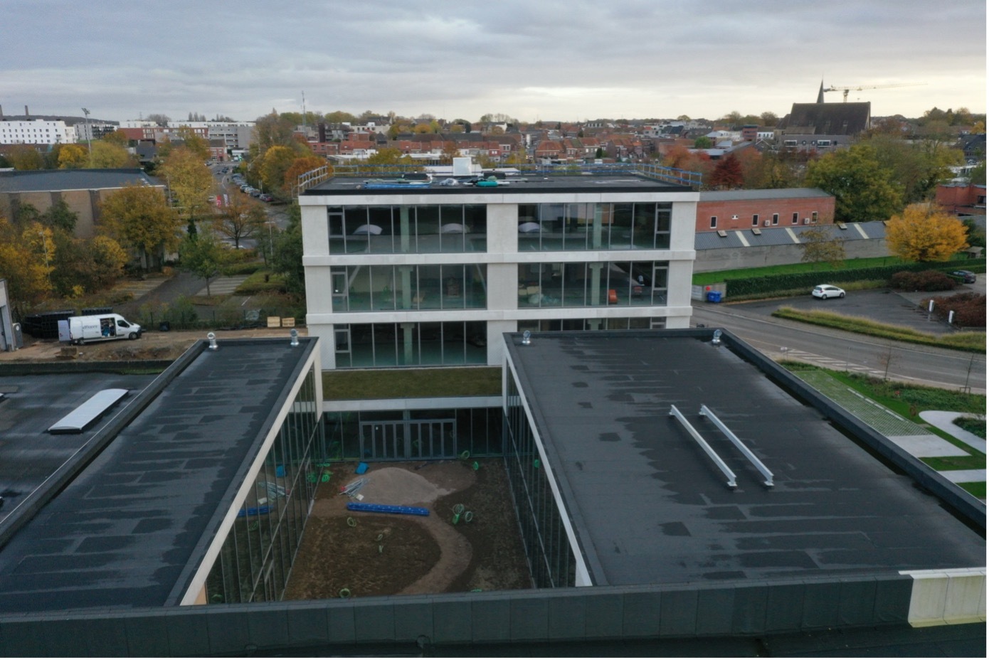 De eerste fase omvatte 22 kmo-units, werd vorige zomer opgeleverd en is ondertussen reeds uitverkocht. Aan de voorzijde van het park wordt op dit moment de tweede fase te koop aangeboden. Dit fraaie architecturale kantoorgebouw wordt volgende zomer opgeleverd en biedt plaats aan 6 kantoren voor ondersteunende functies.